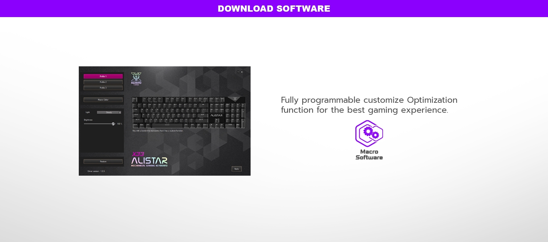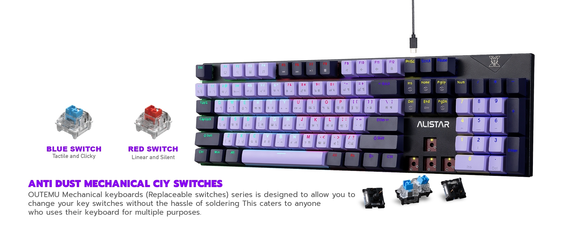 Alistar X33 CIY Keyboard ဟာ အရောင်ငါးမျိုး ရွေးချယ်နိုင်ခြင်း၊ ပုံမှန် Gaming အတွက် လုံလောက်သော Mini RGB မီး Mode ၂၀ ပါဝင်ခြင်းတို့အပြင်၊ ဖုန်မှုန့်ဒဏ်ခံနိုင်တဲ့ စနစ်ကြောင့် သက်တမ်း ပိုရှည်စေပါတယ်။ အရေးကြီးဆုံးကတော့ ၎င်းရဲ့ Software ကို အသုံးပြုပြီး ဂိမ်းကစားသူများအတွက် မရှိမဖြစ်လိုအပ်တဲ့ Macro Functions များကို လွယ်ကူစွာ သတ်မှတ်နိုင်ခြင်းပဲ ဖြစ်ပါတယ်။